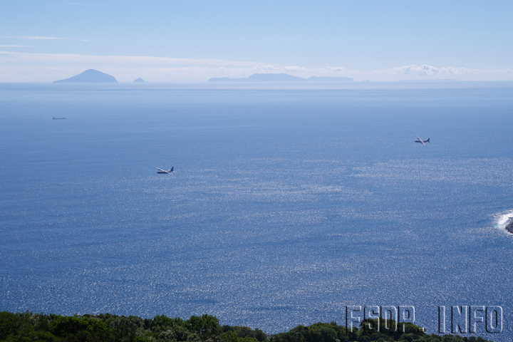 岬を眺めていたら、軍用機2機がエンジン音を響かせて前を通過していきます。写真の通り小高い場所ではありますが、山という程のレベルではありません。しいて言うなら丘でしょうか。そんな場所で見ていても翼の上を見れるのですから相当の低空飛行です。